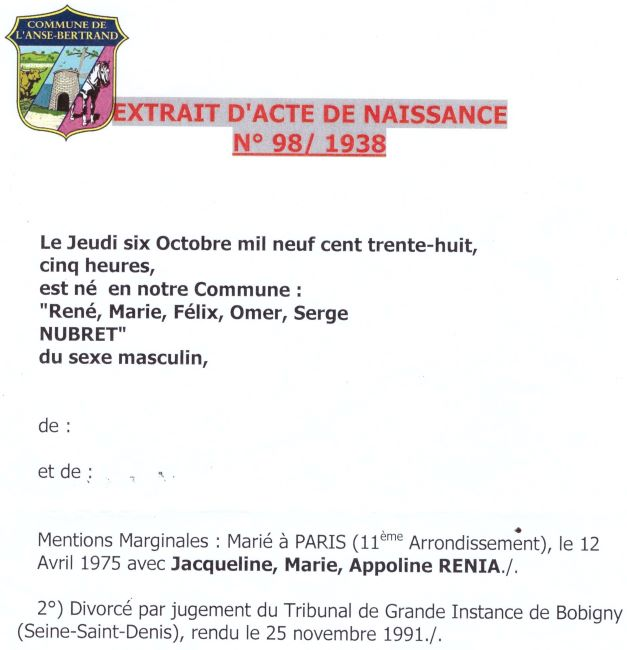 1938 Acte de naissance (Anse-Bertrand, Guadeloupe, Antilles Françaises)