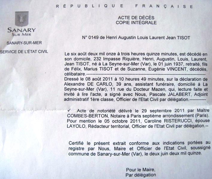 2011 Acte de décès (Sanary-sur-Mer, France)