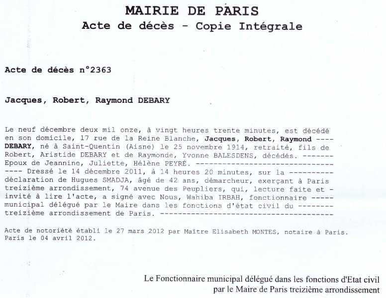 2011 Acte de décès (Paris 13ème, France)
