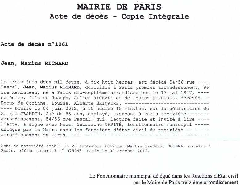 2012 Acte de décès (Paris 13ème, France)