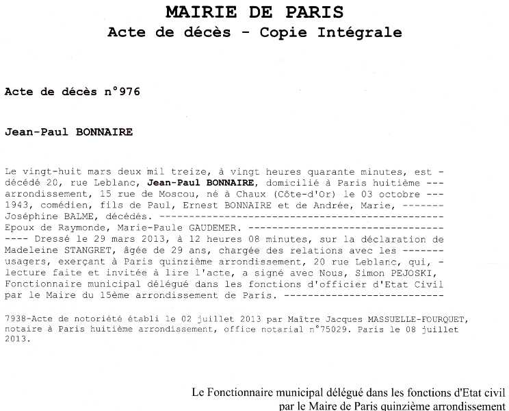 2013 Acte de décès (Paris 15ème, France)