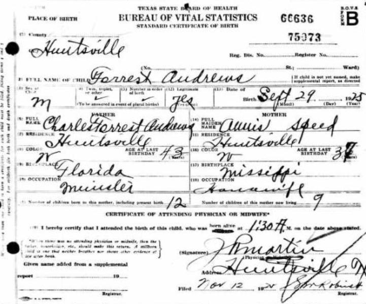 1925 Acte de naissance (Huntsville, Texas, USA)