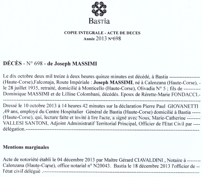 2013 Acte de décès (Bastia, France)