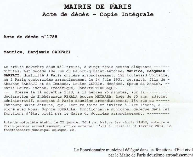 2013 Acte de décès (Paris 12ème, France)
