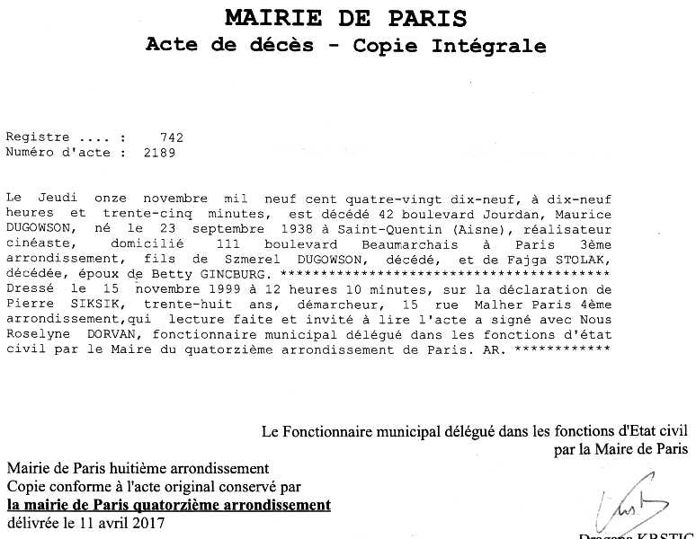 1999 Acte de décès (Paris 14ème, France)