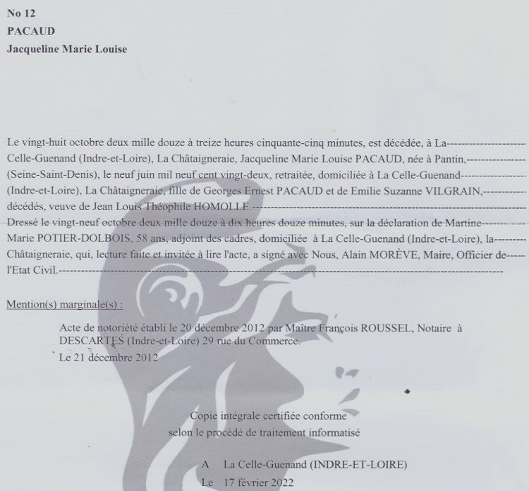 2012 Acte de décès (La Celle-Guenand, France)