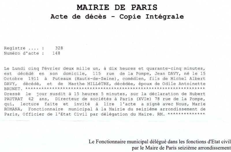 2001 Acte de décès (Paris 20ème, France)