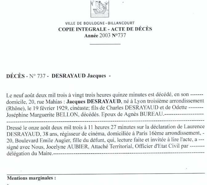 2003 Acte de décès (Boulogne-Billancourt, France)