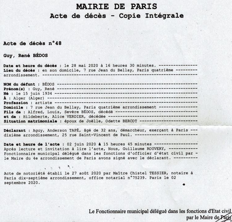 2020 Acte de décès (Paris 4ème, France)