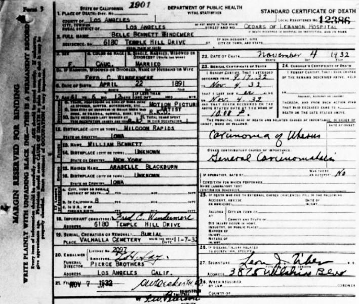 1932 Acte de décès (Los Angeles, Californie, USA)