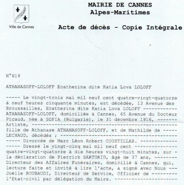 1994 Acte de décès (Cannes, France)