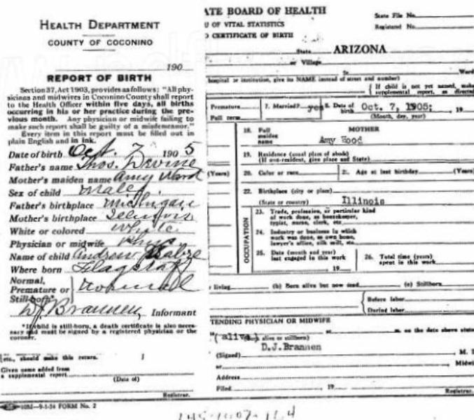 1905 Acte de naissance (Flagstaff, Arizona, USA)