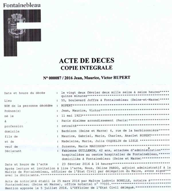 2016 Acte de décès (Fontainebleau, France)