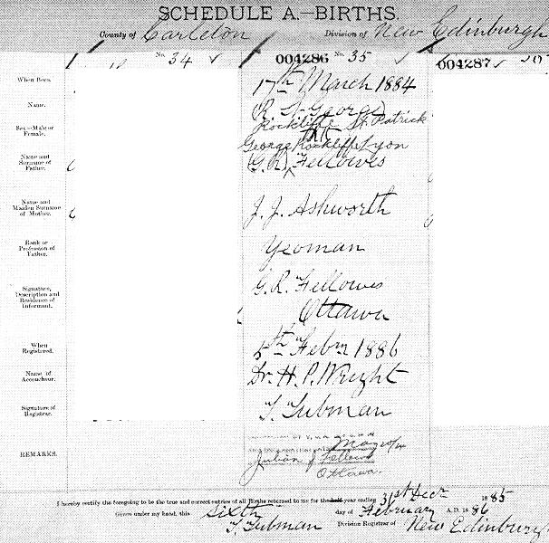 1884 Acte de naissance (Ottawa, Ontario, Canada)