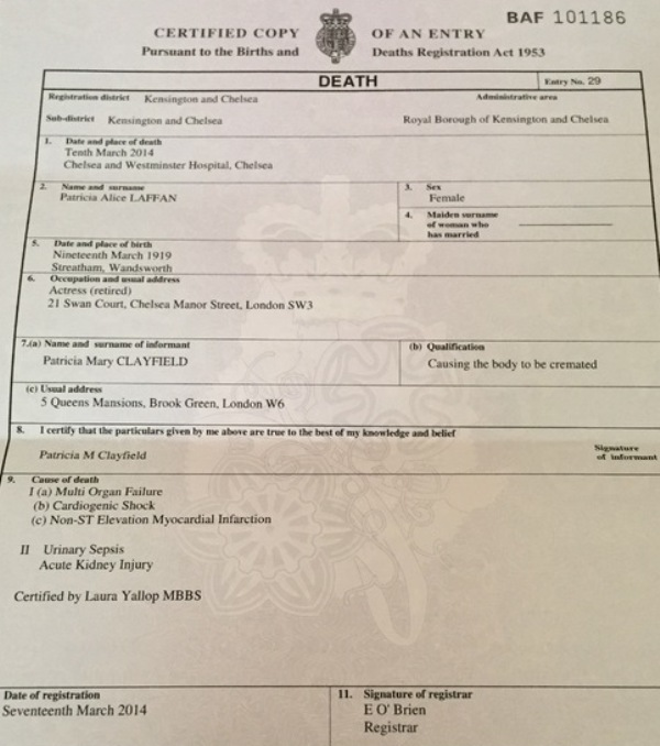 2014 Acte de décès (Londres, Royaume-Uni)
