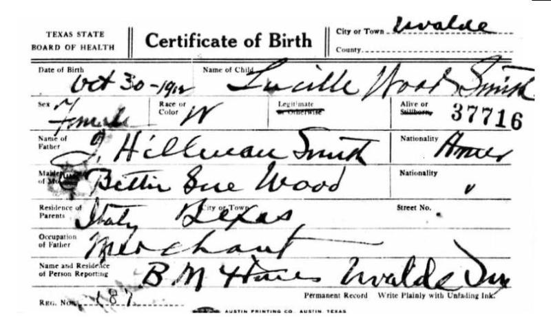 1912 Acte de naissance (Uvalde, Texas, USA)