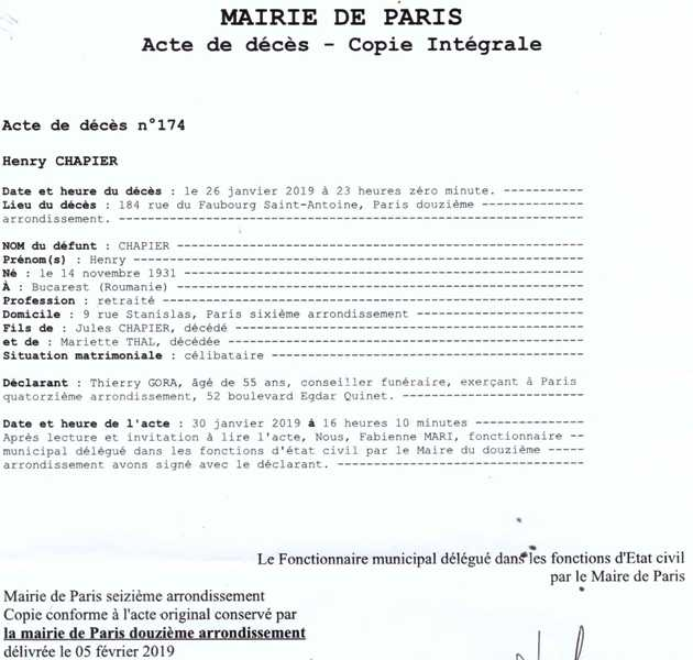 2019 Acte de décès (Paris 12ème, France)