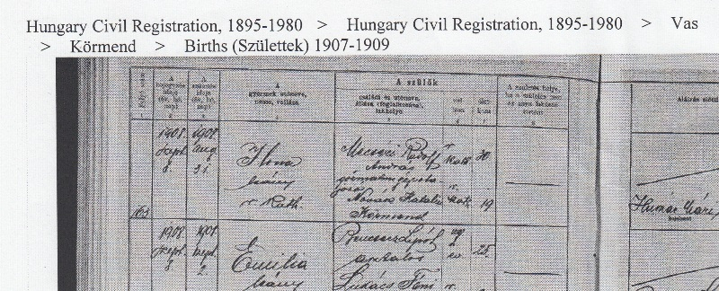 1908 Index des naissances (Körmend, Empire Austro-Hongrois)
