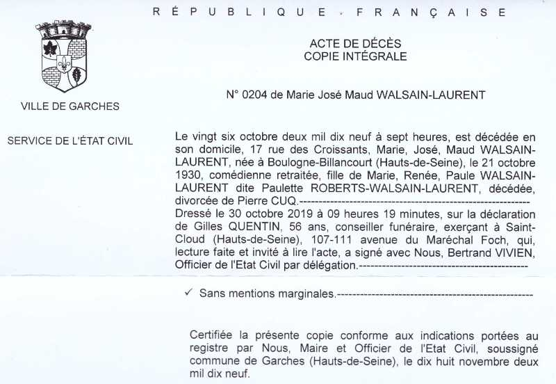 2019 Acte de décès (Garches, France)