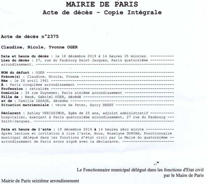 2019 Acte de décès (Paris 14ème, France)