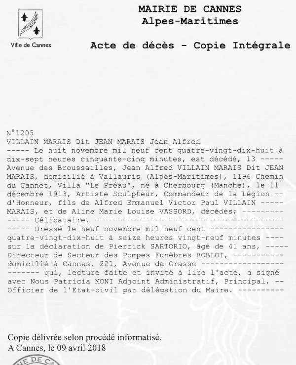 1998 Acte de décès (Cannes, France)