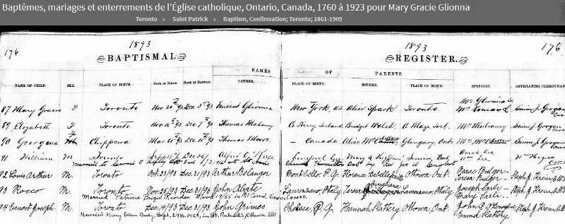1893 Première ligne du registre des baptêmes (Toronto, Ontario, Canada)