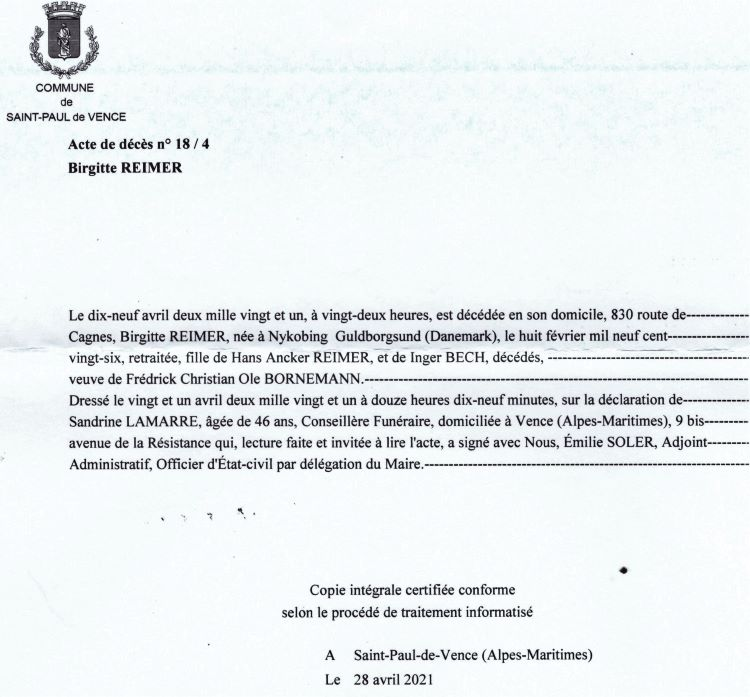 2021 Acte de décès (Saint-Paul de Vence, France)
