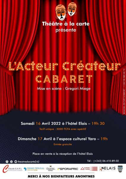 ![]() 2022 à Pointe-Noire, le 11 mars, avant-première du film «Parcours» de Saïd Bongo | ![]() 2022 à Pointe-Noire, le 11 mars, avant-première du film «Parcours» de Saïd Bongo | ![]() 2022, l7 avril, pièce «L’acteur créateur cabaret» au Théâtre à la Carte de Pointe-Noire | ![]() 2022, l7 avril, pièce «L’acteur créateur cabaret» au Théâtre à la Carte de Pointe-Noire | ||