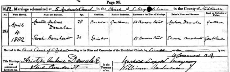 1882 Acte de mariage (Londres, Royaume-Uni)