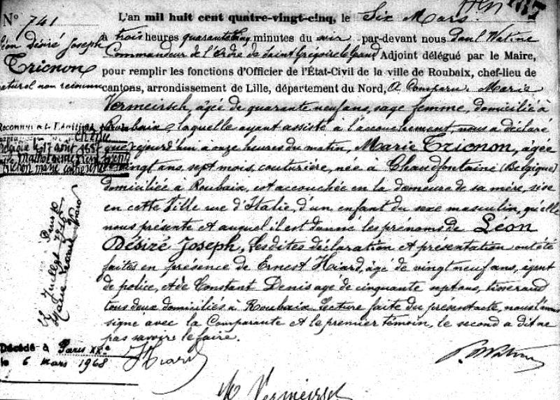 1885 Acte de naissance (Roubaix, France)