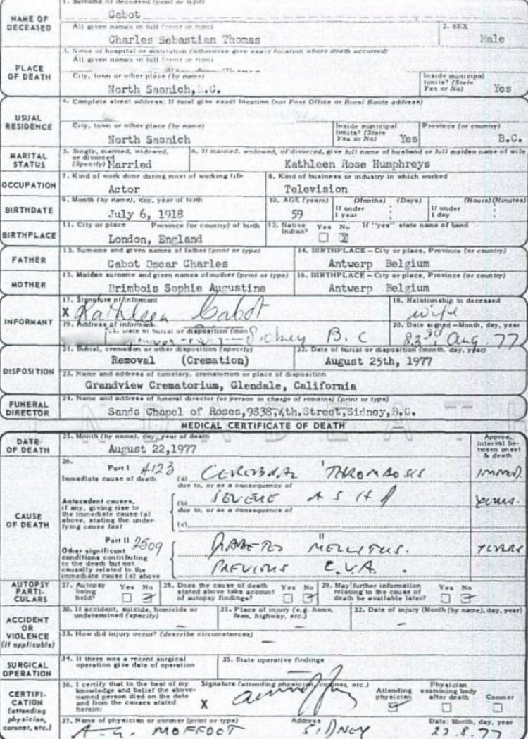 1977 Acte de décès (North Saanich, Colombie Britannique, Canada)