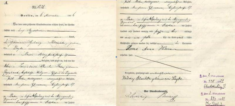 1896 Acte de naissance (Berlin, Empire Allemand)