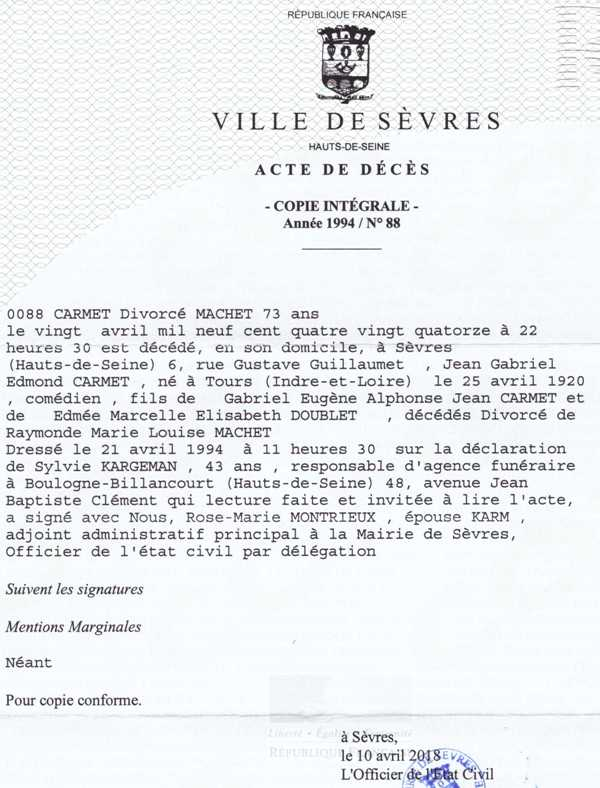 1994 Acte de décès (Sèvres, France)
