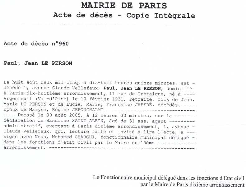 2005 Acte de décès (Paris 10ème, France)