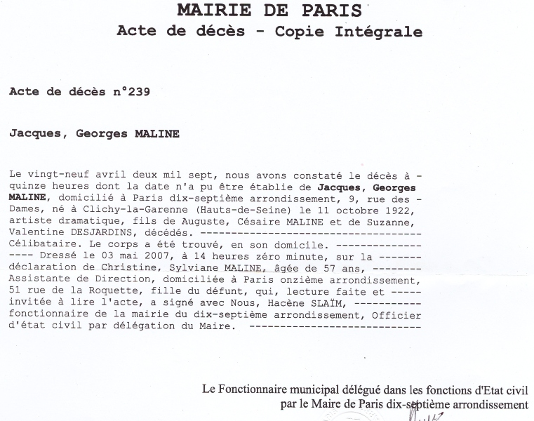 2007 Acte de décès (Paris 17ème, France)