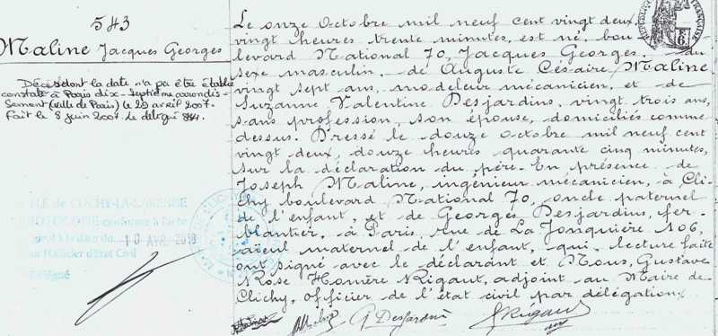 1922 Acte de naissance (Clichy-la-Garenne, France)